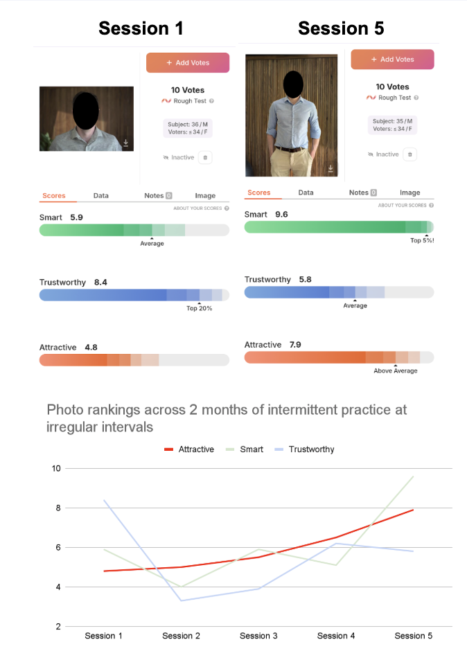 We coached our friend over the course of two months (admittedly at very inconsistent times) through somatic-based practices aimed at shifting his presence. We photographed him before and after five of those sessions, each time submitting the photos to PhotoFeeler to get rated by 10 randomly selected women 34 years old or younger.